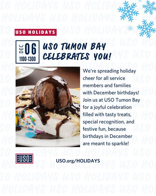 We want to take a joyful moment to celebrate YOU—all service members and families with December birthdays! Swing by USO Tumon Bay as we honor our birthday celebrants with sweet treats, warm holiday cheer, and a little extra sparkle to wrap up the year. Let’s make your special day shine brighter this festive season!