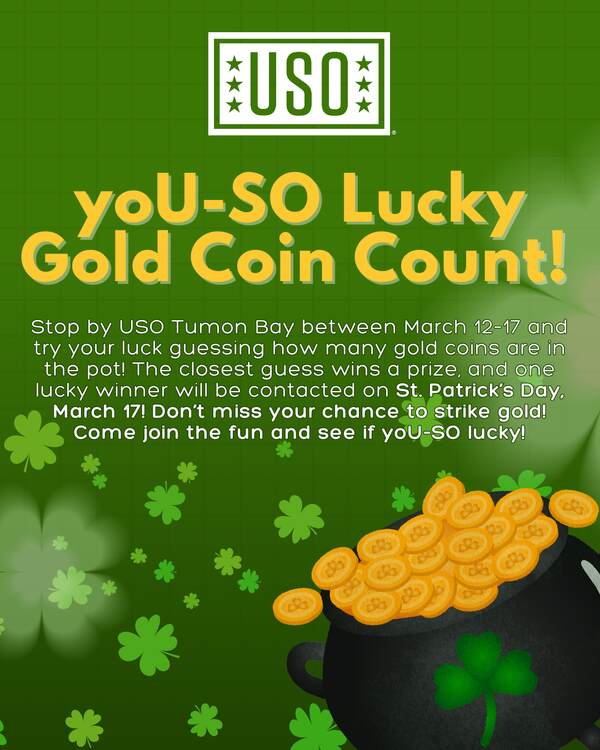 From March 12–17, patrons are invited to visit the USO center and locate the pot of gold at the end of the rainbow displayed on the USO table. They will take a close look at the chocolate gold coins inside and submit their best guess by filling out a slip with name, contact information, and estimated number of coins, then place it in the designated container. The patron with the closest guess will be declared the winner and contacted on March 17.