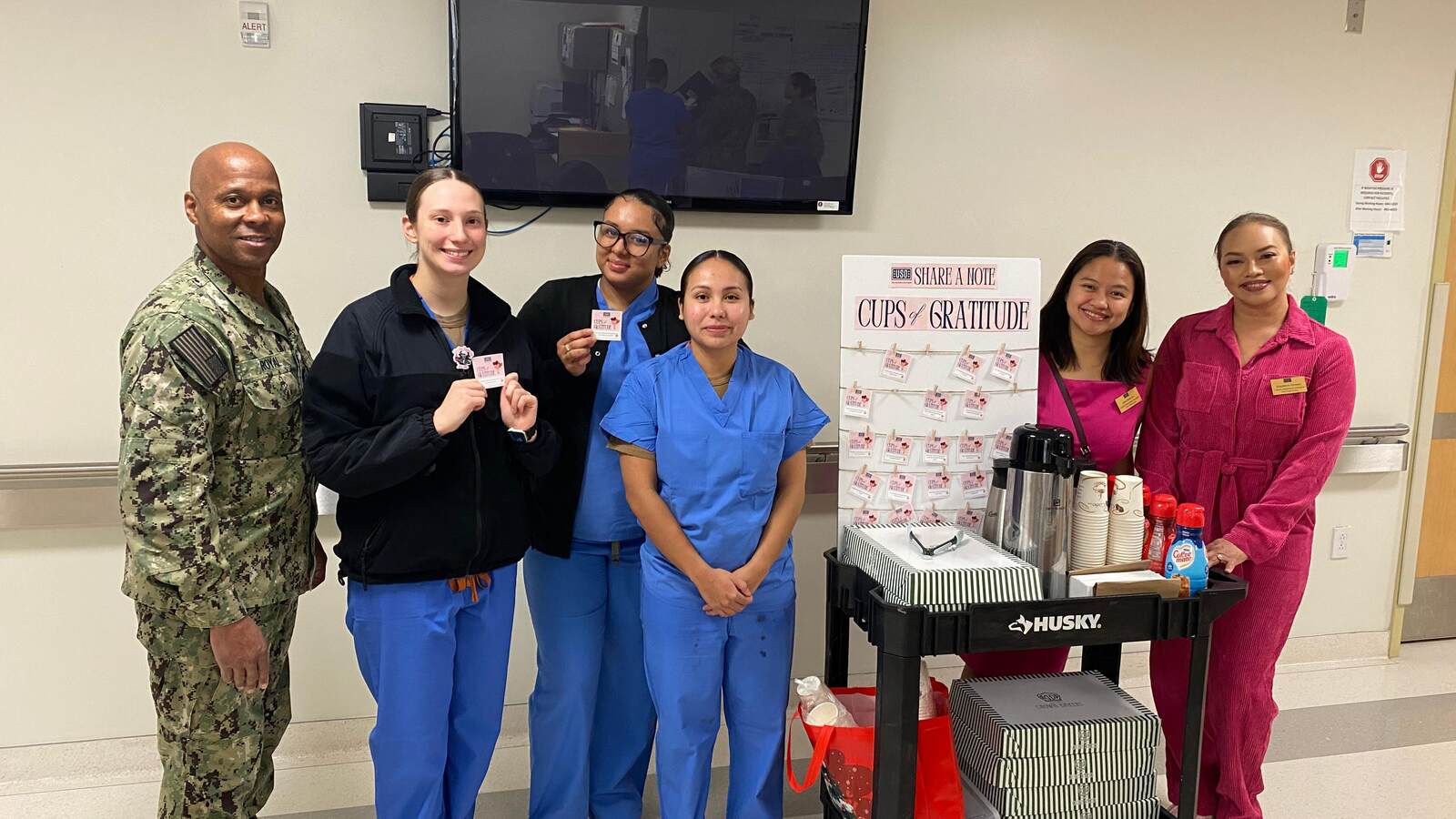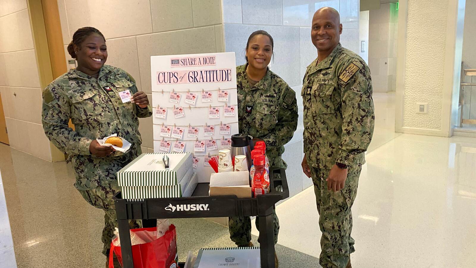First launched at U.S. Naval Medical Readiness Training Command (NMRTC) in February of 2025, Cups of Gratitude is an initiative designed to bring joy and encouragement to service members as they start their day. With the guidance of NMRTC Command Master Chief (CMC) Anthony Royale, we make our way through every department, handing out a fresh cup of coffee paired with delicious donuts. While the treats are often appreciated with joy, what truly resonates are the inspirational notes of Gratitude, short heartfelt messages filled with words of encouragement. These notes remind our military community that their efforts are not only recognized but deeply appreciated by the community they serve. The positive response of the program allowed the team to expand this effort to Apra Clinic.