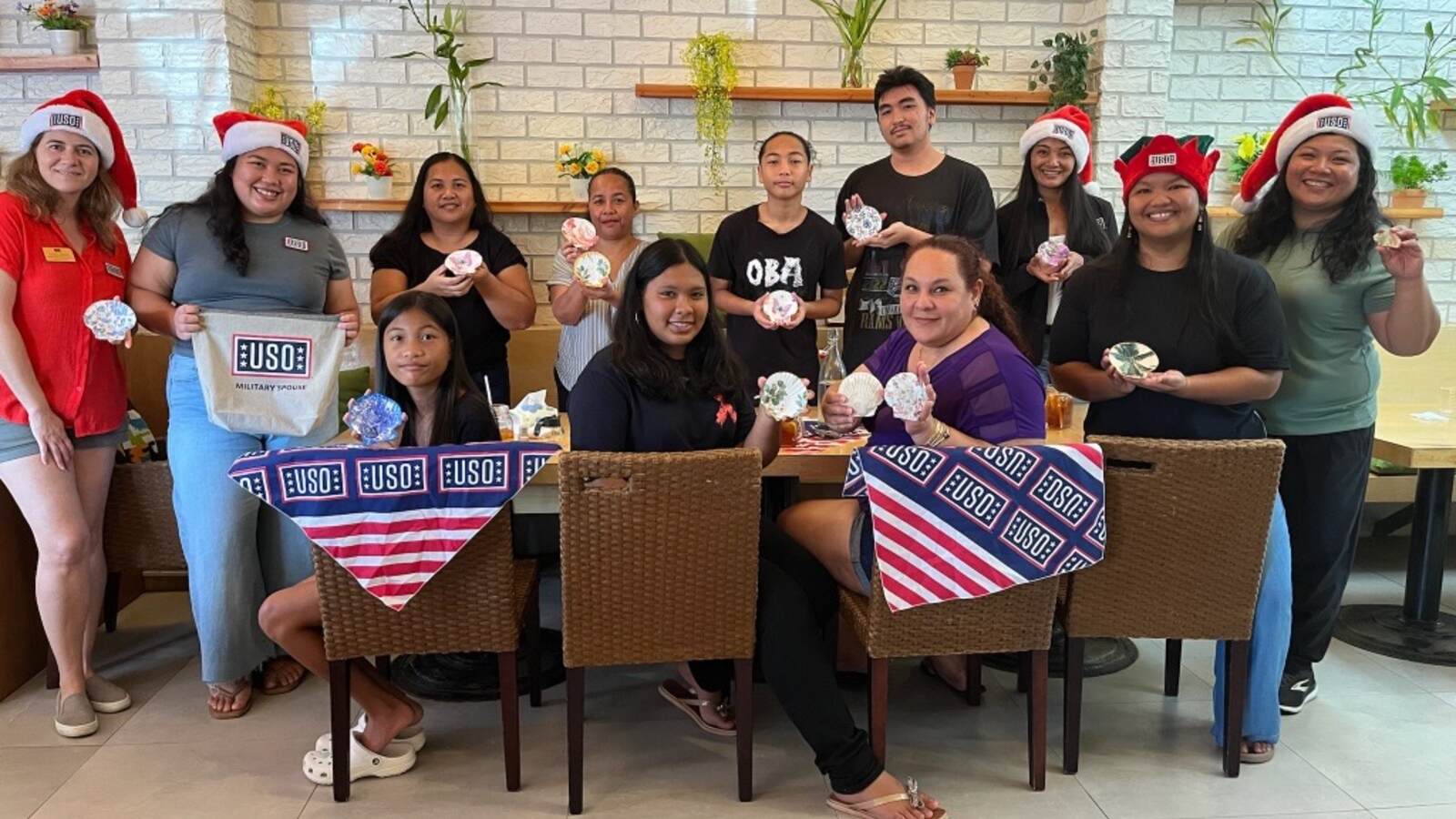 In addition, the USO hosted Coffee Connections for military spouses, providing a safe and supportive environment for them to connect, share experiences, and build lasting networks. Spouses had the opportunity to create and customize seashell holders using mod podge and festive table napkins. These gatherings play a critical role in strengthening resilience among military families, especially in remote locations like the Marianas.